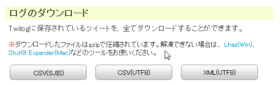 - ログのダウンロードの項の[CSV(UTF8)]と[XML(UTF8)]ボタンでダウンロードします