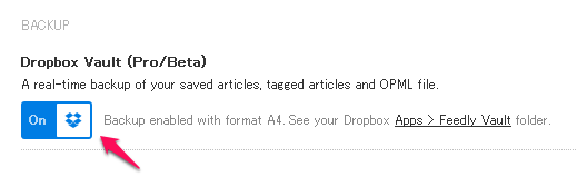 Dropboxに対して登録フィードのリスト(OPML形式)と、しおりアイコン(save for later)を選択したフィード記事(html形式、又はPDF形式)の自動バックアップを行う事が出来ます(Dropbox Vault)