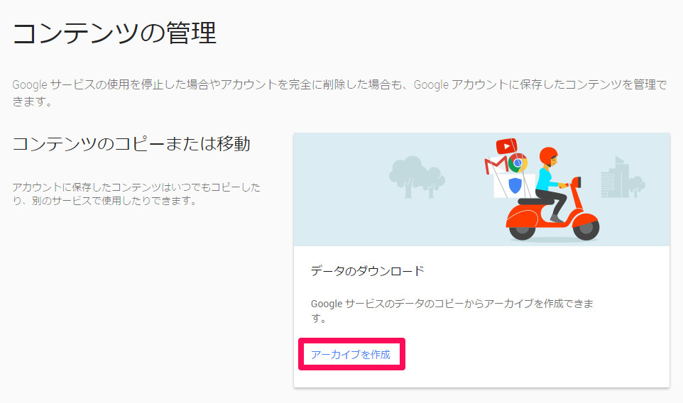 - 再度「自分のデータをダウンロード」の画面に行き、[アーカイブを管理]ボタンを選択します