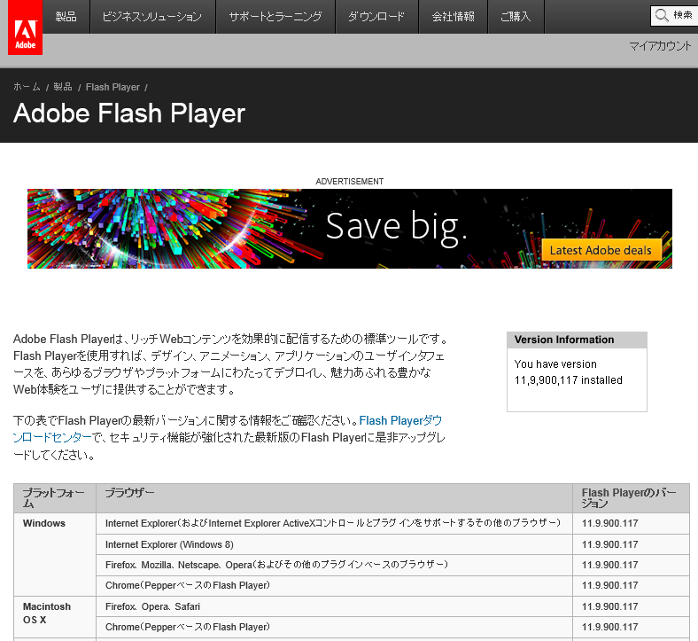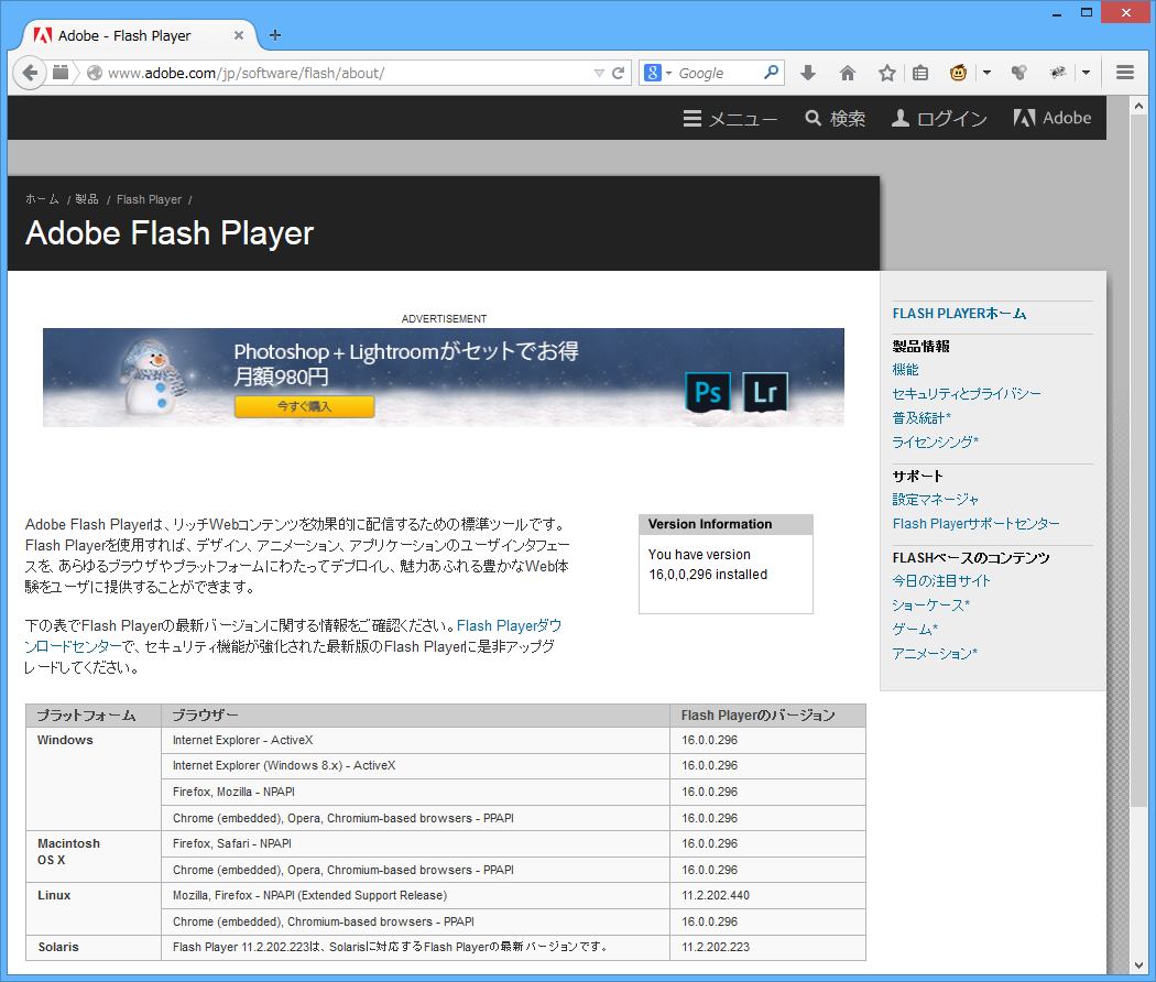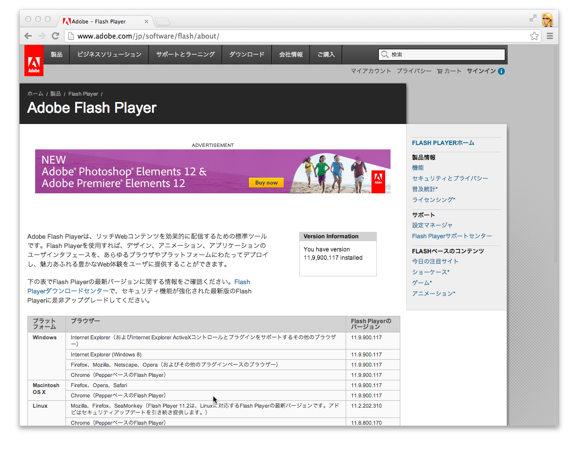 | Webブラウザ | Flash種類 | 最新バージョン (2014/12/12確認) |