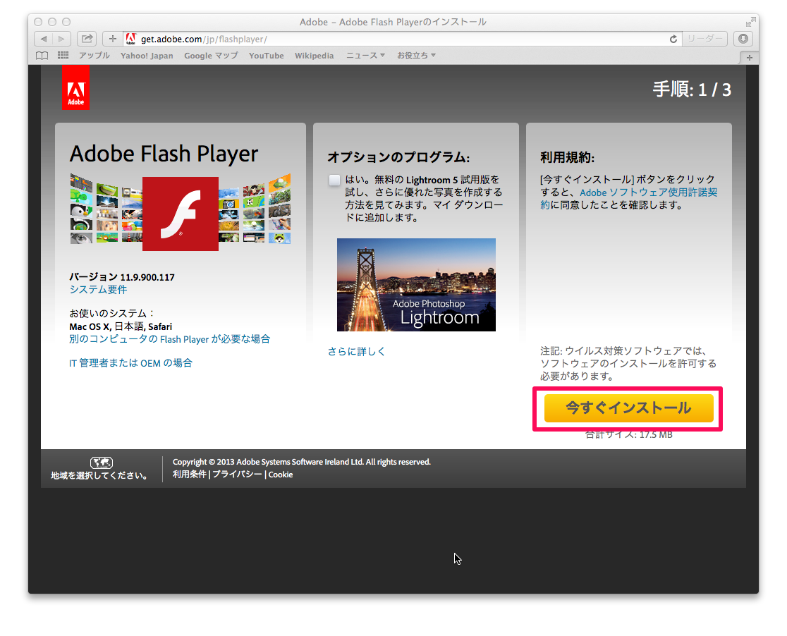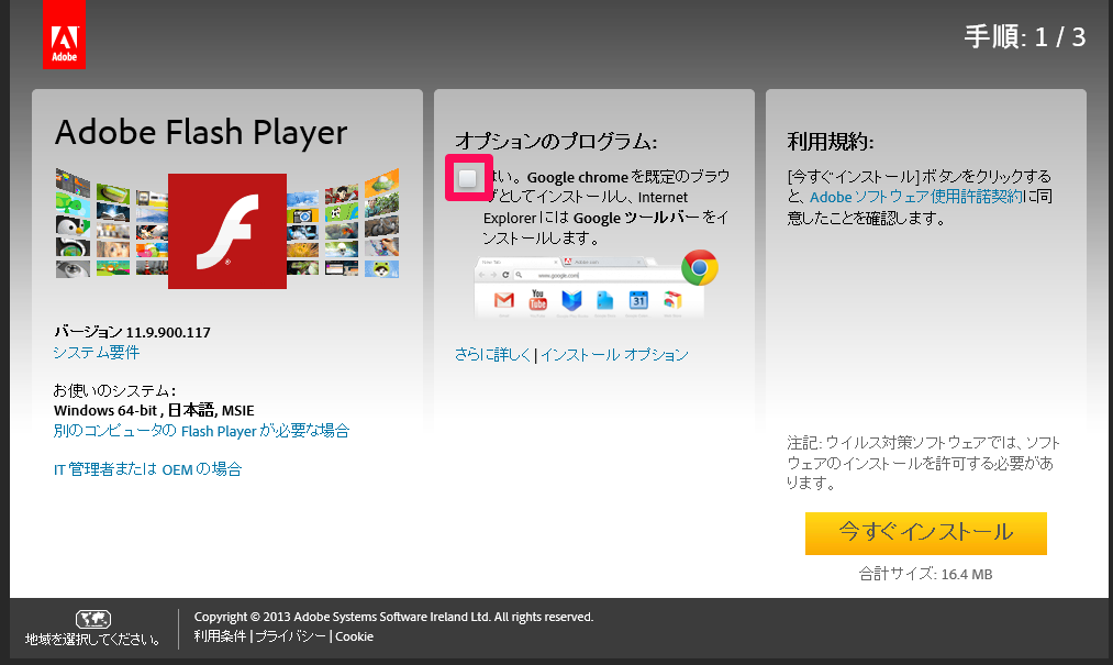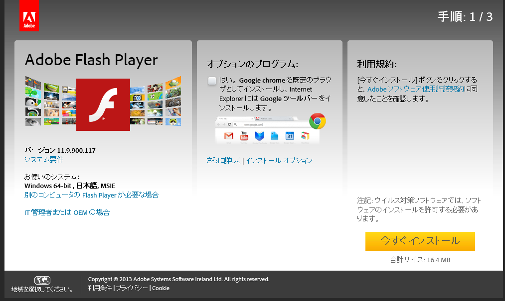 ※自分の環境ではこの回答を受けた時間には既に最新版のAdobe Flashが自動で入ってたので、この手順を試せていません。