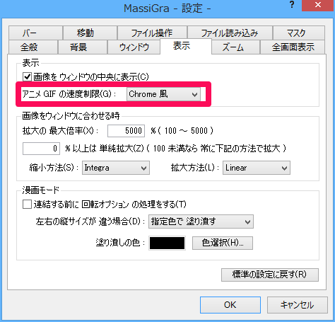 - [表示]タブ→「表示」の項の「アニメ GIF の速度制限」を「制限なし」以外の設定にする(例:Chrome風)