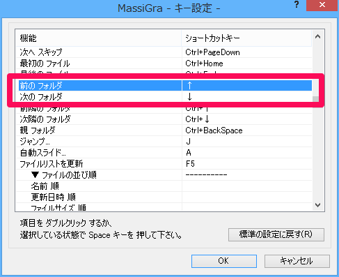 - 「前の フォルダ」と「次の フォルダ」の項目のショートカットキー設定を消す