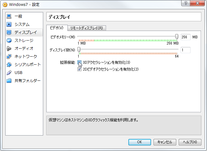 - [3Dアクセラレーションを有効化] チェック ボックスをオンにします。