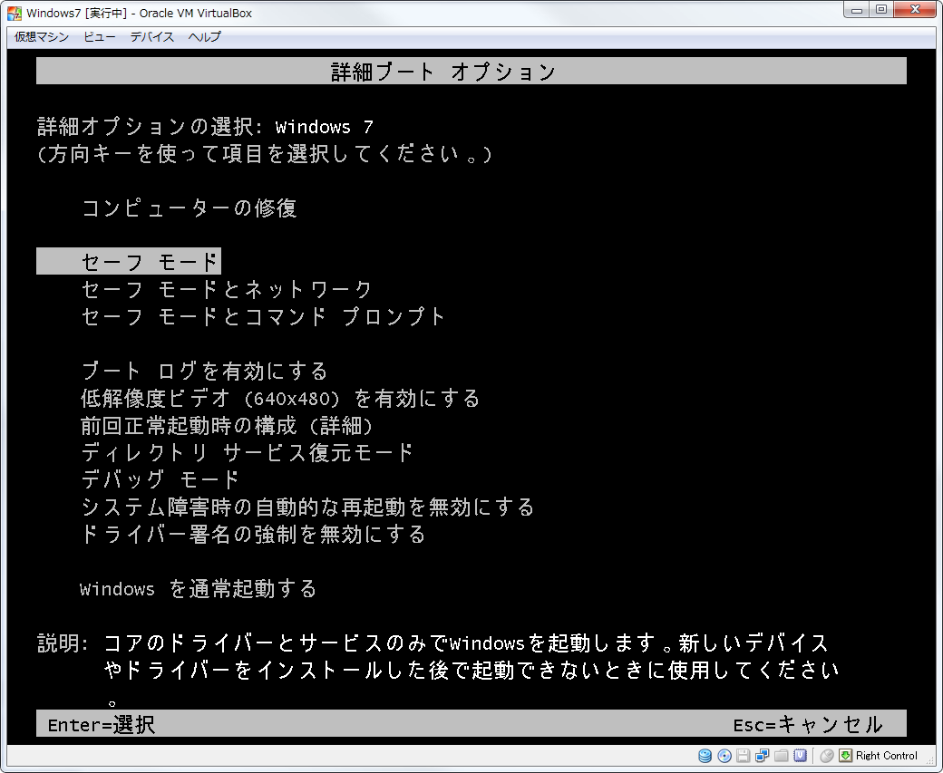 - [↑][↓]キーを押してセーフモードを選択し、[Enter]キーを押して起動します。