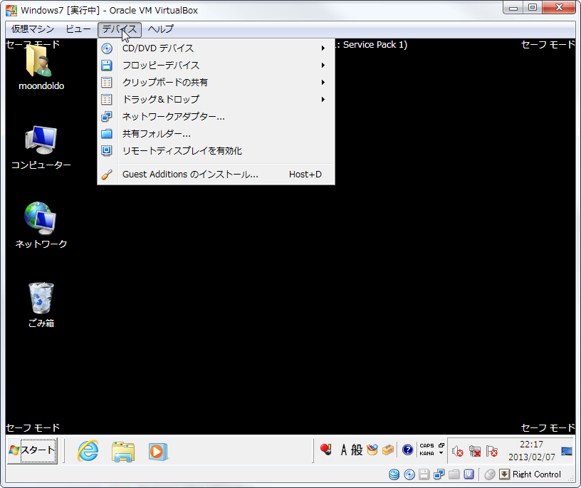 - 仮想環境のWindows7が起動したらログインして、上記のメニューの [デバイス] をクリックします。