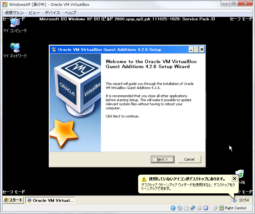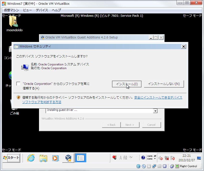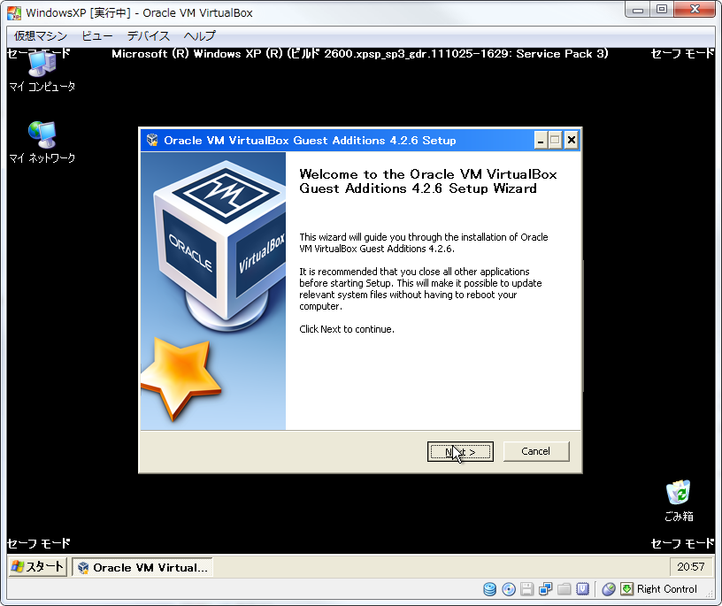 ※インストーラが起動しない場合は、マイコンピュータ→CDドライブをダブルクリックして、中にある「VBoxWindowsAdditions」(又は「VBoxWindowsAdditions.exe」)をダブルクリックして手動で起動させて下さい