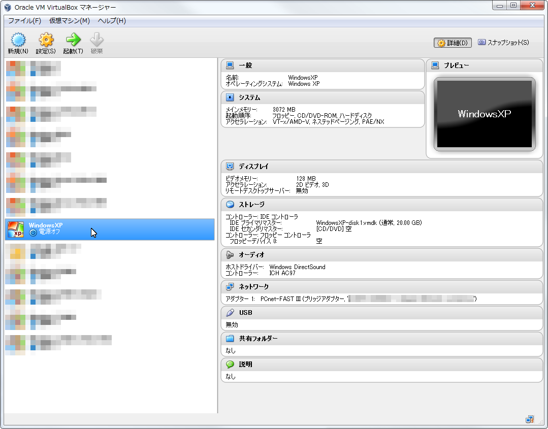 - WindowsXPをインストールした仮想環境を右クリックします。