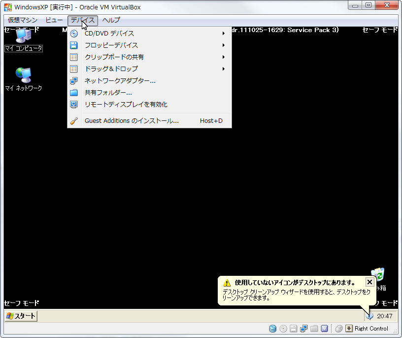 - 仮想環境のWindowsXPが起動したらログインして、上記のメニューの [デバイス] をクリックします。