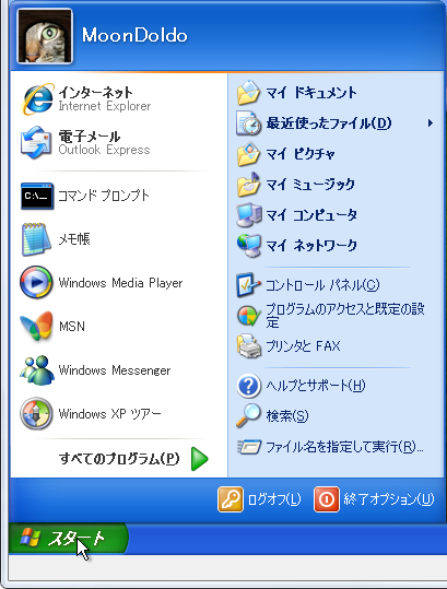 - 仮想環境のWindowsXPが起動したらログインして、[スタート] をクリックします。