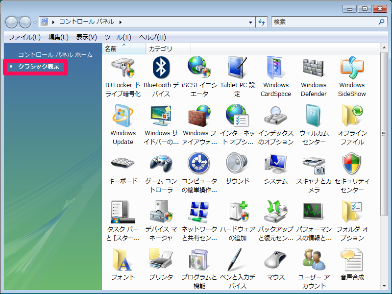 Vistaは[コントロール パネル ホーム] リンクを選択します。