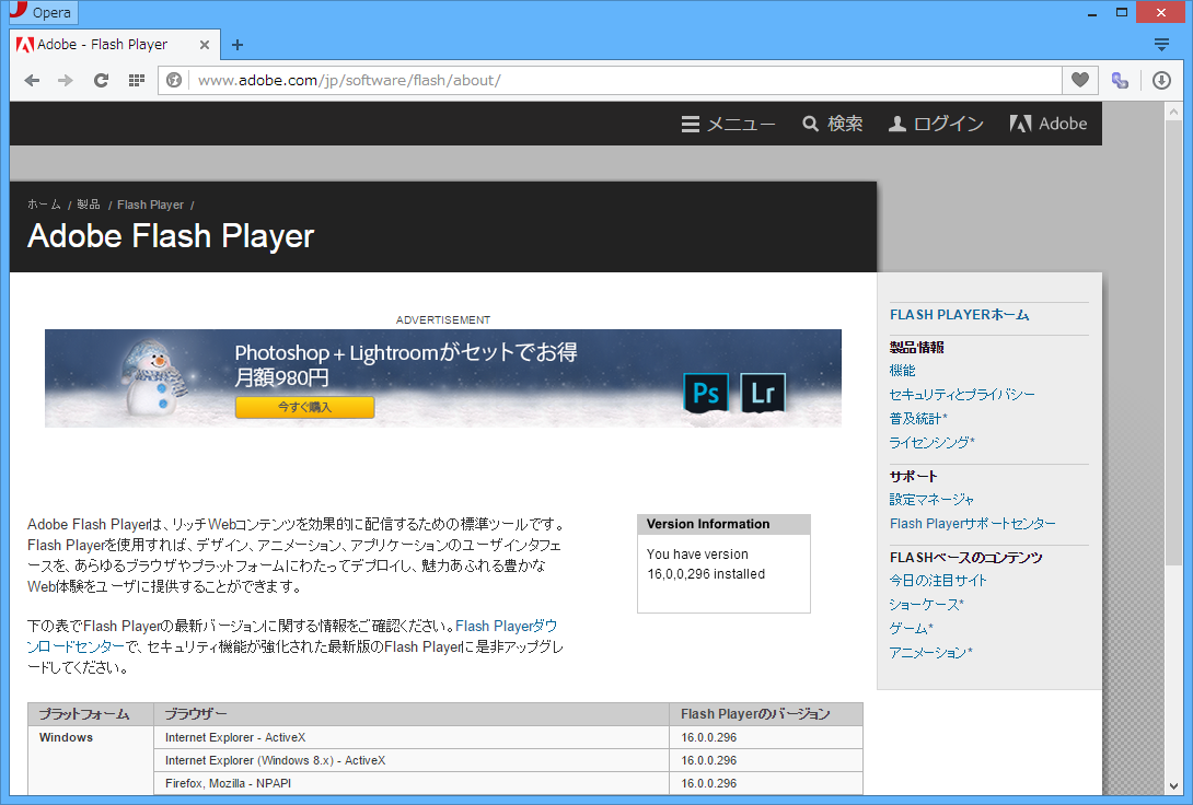 | Webブラウザ | Flash種類 | 最新バージョン (2015/7/14確認) |