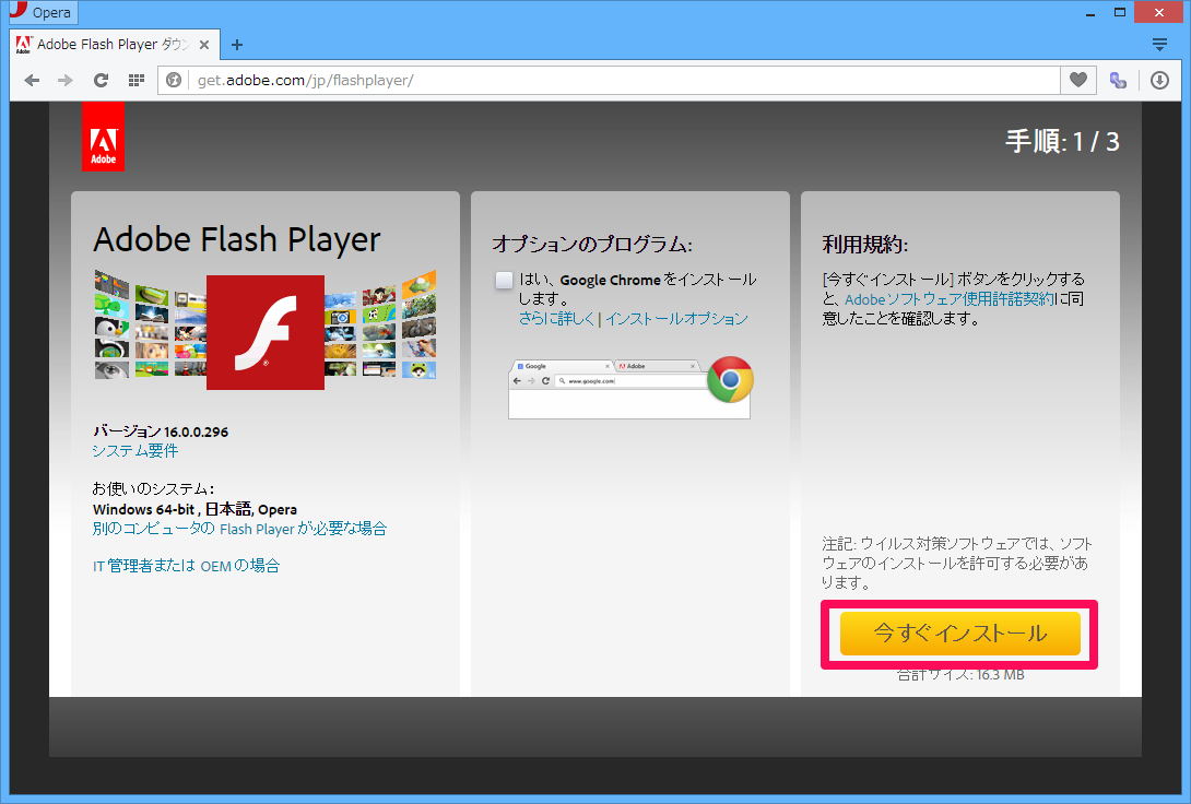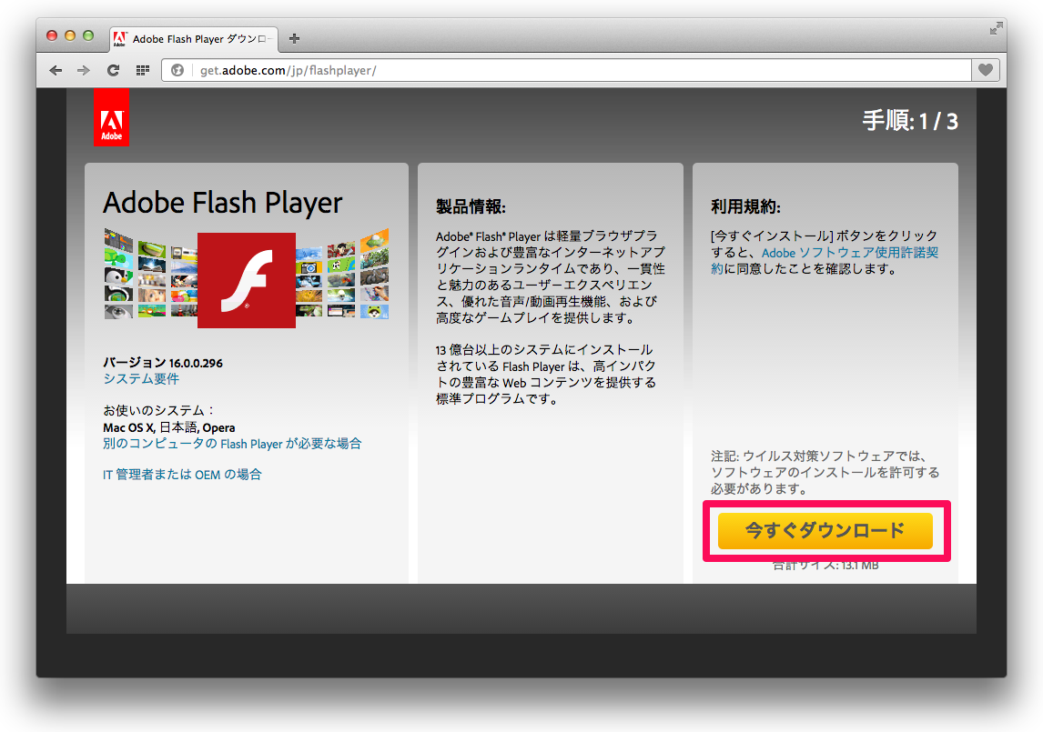 - ダウンロードしたファイルをダブルクリックして新しいバージョンのAdobeFlashをインストールします。