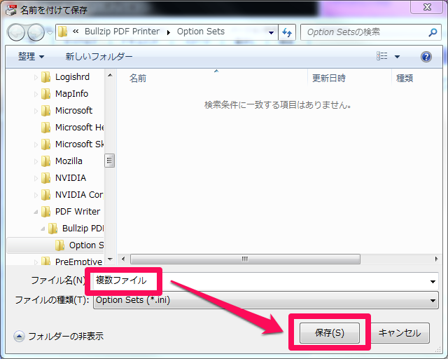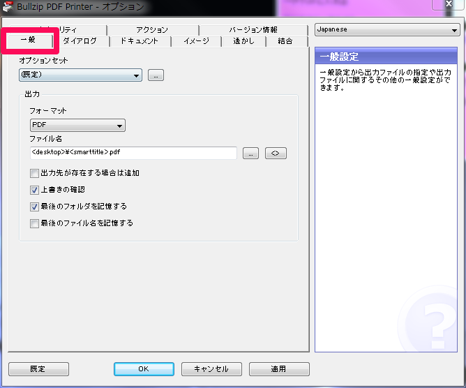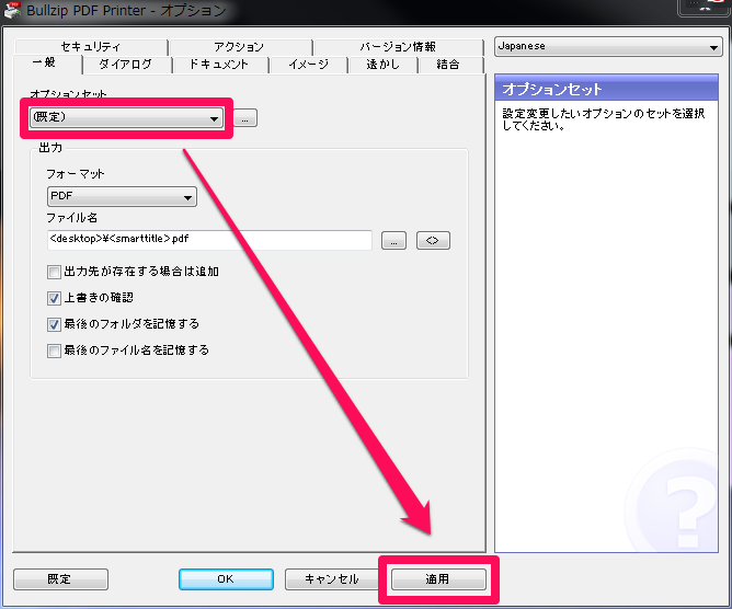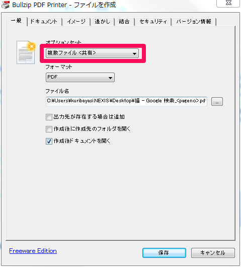 次回から、Bullzip PDF Printer へ印刷した際に出てくるダイアログの「オプションセット」を[複数ファイル]に設定すれば、1ページ1ファイルで出力される様になります