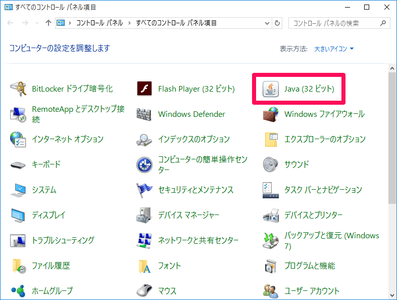 ※[Java]又は[Java(32 ビット)]のアイコンが無い場合は、Javaが入っていないのでアップデートする必要はありません