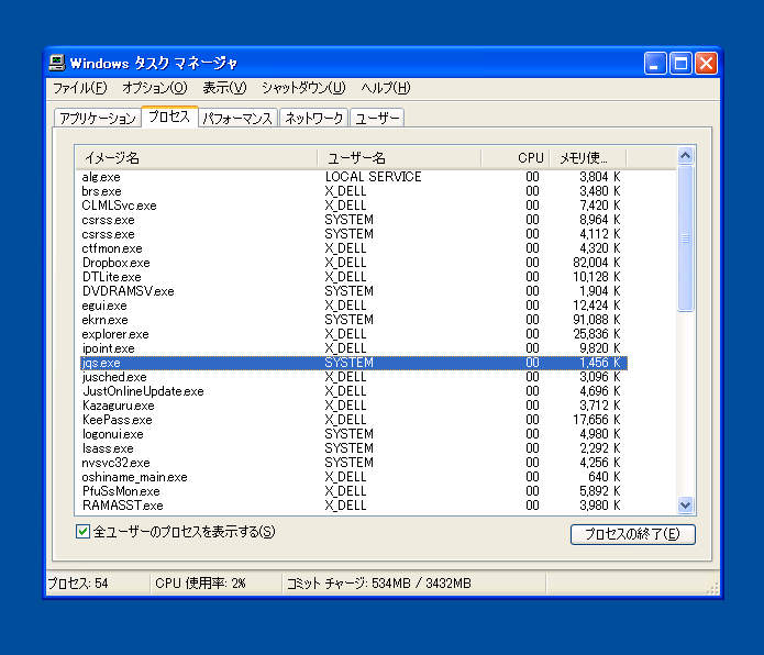 - タスクマネージャーを起動して、プロセスの「jqs.exe」を選んで[プロセス終了]ボタンを押した後、再度インストールを試してみて下さい