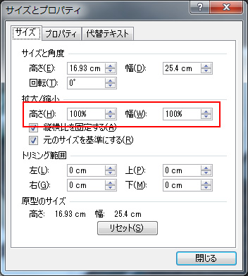 - 「サイズとプロパティ」ウインドウの[サイズ]タブの[拡大/縮小]欄の高さを100%・幅を100%にする