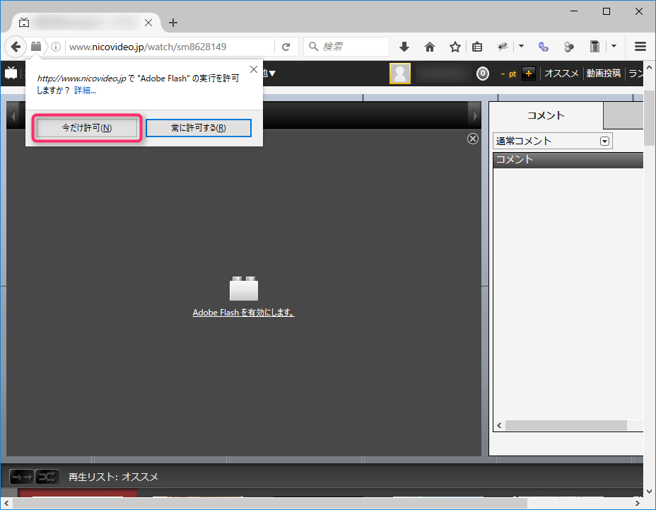 以後はFlashは自動実行せず、アドレスバーの左にあるアイコンクリック→「今だけ許可」ボタンを押す操作によって動作する様になります