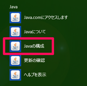 - Windowsのスタートメニューのプログラム一覧にある「Javaの構成」を選択すると、Javaコントロール・パネルが起動します
